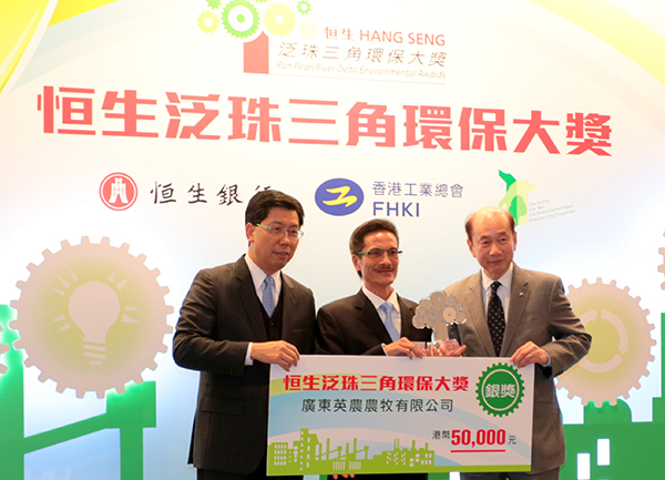 2014年3月5日,“2012/13恒生泛珠三角環(huán)保大獎(jiǎng)”評(píng)選頒獎(jiǎng)典禮在恒生銀行香港總部博愛堂隆重舉行,廣東英農(nóng)農(nóng)牧有限公司榮獲銀獎(jiǎng),英農(nóng)農(nóng)牧總經(jīng)理梁志鵬先生代表英農(nóng)團(tuán)隊(duì)領(lǐng)取該獎(jiǎng)項(xiàng),香港環(huán)保局副局長(zhǎng)陸恭蕙女士和香港工業(yè)總會(huì)劉展灝先生擔(dān)任主禮嘉賓。