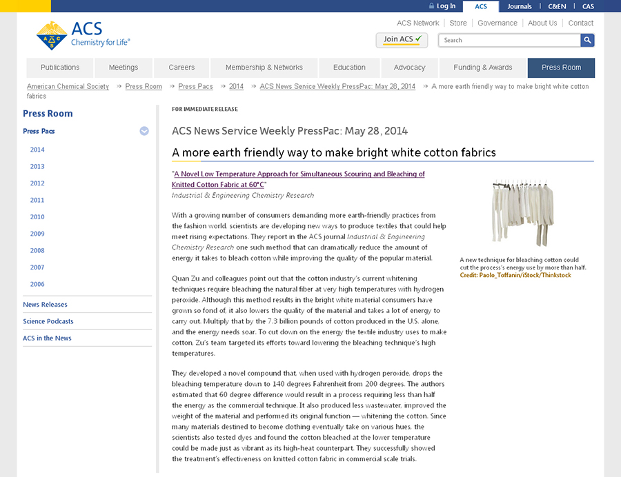 2014年5月28日,在美國(guó)化學(xué)學(xué)會(huì)(ACS)的雜志Industrial &Engineering Chemistry Research(IECR)即工業(yè)與工程化學(xué)研究雜志,發(fā)表了我公司有關(guān)低溫練漂的研究論文:《A Novel LowTemperature Approach for Simultaneous Scouring and Bleaching of Knitted CottonFabric at 60°C》(一種在60℃對(duì)棉針織物同時(shí)進(jìn)行精練和漂白的新型低溫加工工藝),為此,ACS的新聞周刊還專門撰文介紹,題目為“A more earth friendlyway to make bright white cotton fabrics”(一種更加環(huán)保的棉織物漂白方法)。