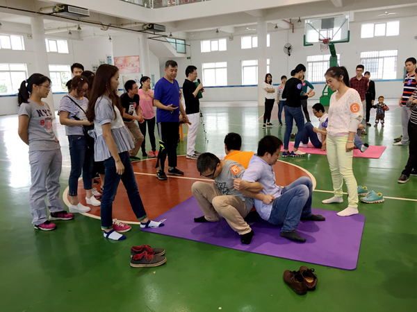 活動壓軸戲是“平起平坐”項目,是對選手們團隊合作意識的終極考驗。在游戲中,5名選手們要背對背、手挽手地完成起立和坐下的動作。各隊必須形成一個整體,步調(diào)一致才能完成起身和坐下的動作,為此,各隊進行多次的嘗試和練習(xí),找到了各自的節(jié)奏與方法完成了比賽。